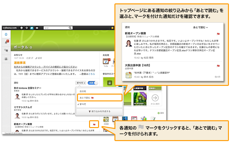 ※「あとで読む」マークを付けられるのは、2013年11月度の定期メンテナンス以降に送信された通知のみです。ご了承ください。