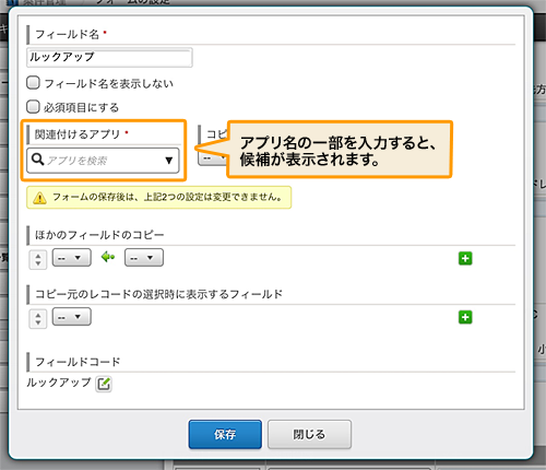 ルックアップ・関連レコード一覧フィールドの設定画面で、関連付けるアプリをキーワード検索して選べます。
