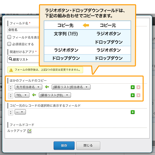 ルックアップが、ラジオボタン・ドロップダウンフィールドでも利用できます。