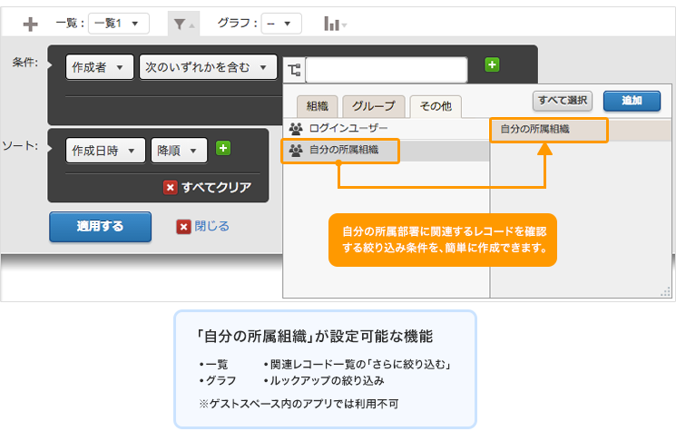 ユーザーを絞り込む条件の選択肢に「自分の所属組織」が加わります。自分の所属部署に関連するレコードを確認する絞り込み条件を、簡単に作成できます。