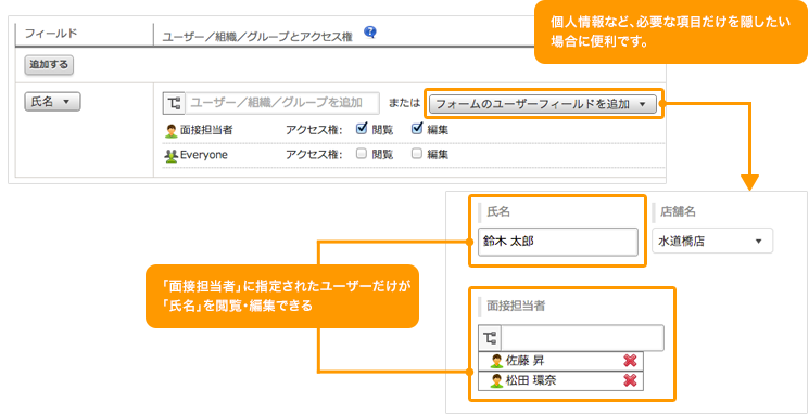 フィールドのアクセス権設定でも、フォーム内の「ユーザー選択」フィールドを条件に指定できるようになりました。個人情報など、必要な項目だけを隠す場合に便利です。