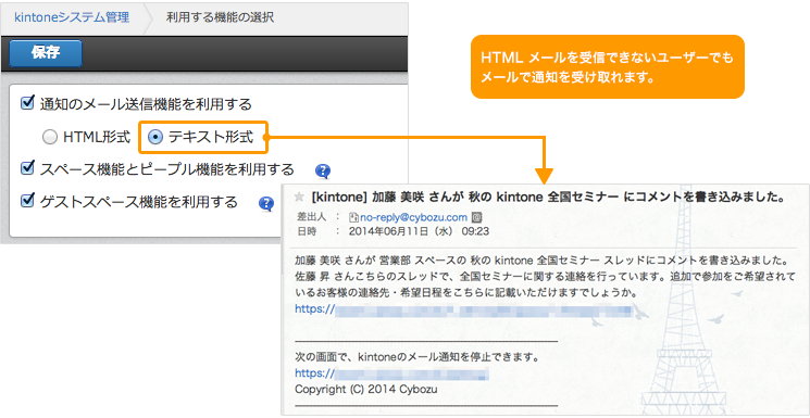 「kintone」の通知メールを、HTML 形式/テキスト形式から選べるようになります。HTML メールを受信できないユーザーでも、メールで通知を受け取れます。