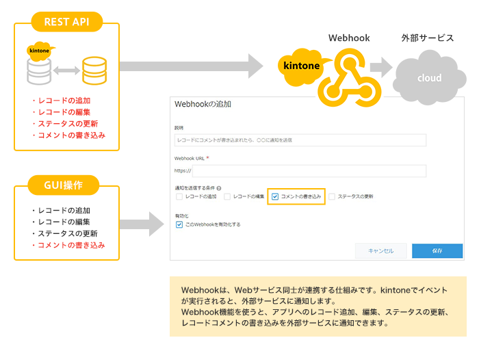 外部サービスと連携するためのWebhook機能が、1つのレコードを操作するREST APIによるレコード操作でも使えるようになりました。