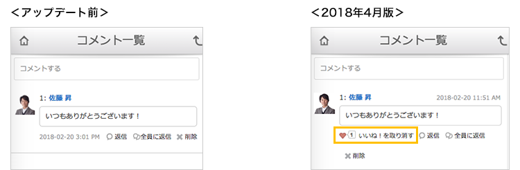 モバイルビューのアプリのコメントに「いいね」ボタンが追加されました。