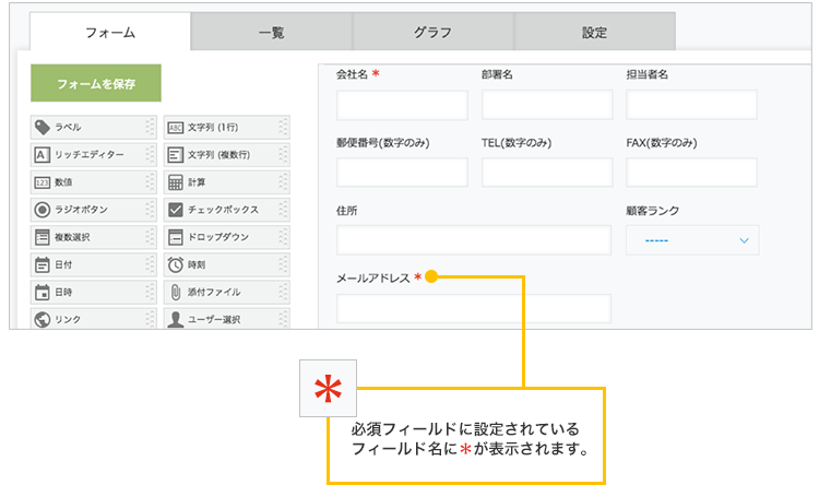 アプリの設定画面のフォームの設定画面で、必須フィールドに設定されているフィールドが分かるようになりました。