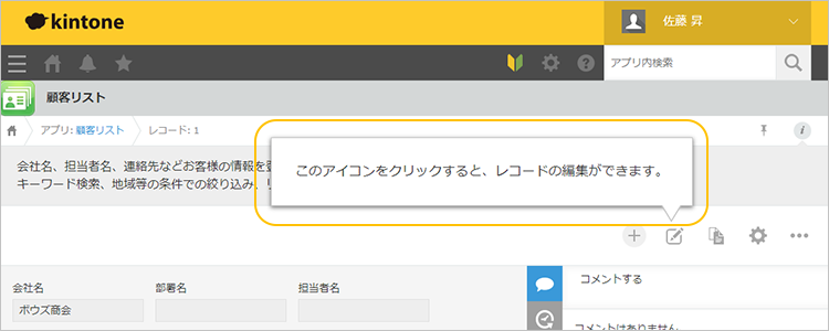 kintoneを使いはじめたばかりの人でもレコードをスムーズに編集できるように、レコード詳細画面の編集ボタンに吹き出し表示を追加しました。