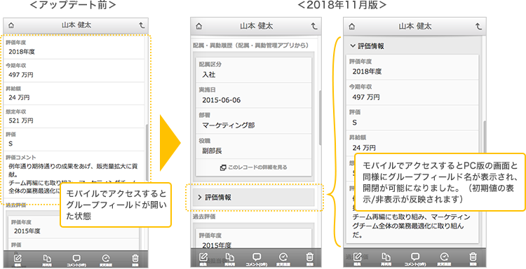 モバイルから開いたときには、特定のグループフィールドだけ開いた状態にするなどのカスタマイズが可能です。