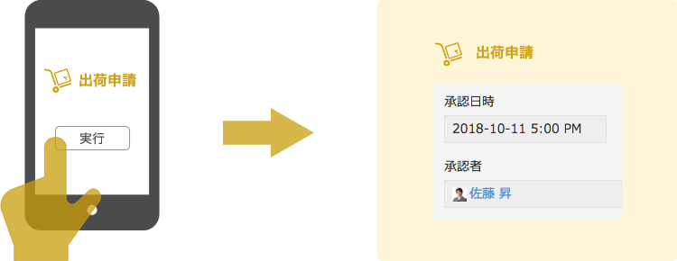 モバイルからプロセス管理の実行ボタンを押すと、自動的にプロセスが実行された日時の情報を他のフィールドに保存するといったカスタマイズが可能になります。