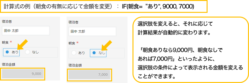計算式の中で「ドロップダウン」フィールドおよび「ラジオボタン」フィールドを参照できるようになりました。IF関数の条件式として利用することができます。