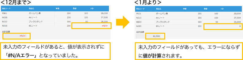 「入力なし」のフィールドを含む計算が可能に(#N/A!エラー表示が解消)