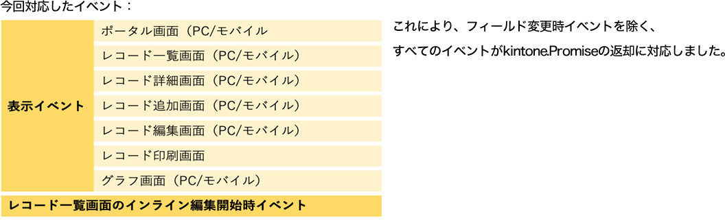すべての画面表示イベントのハンドラ内で、kintone.Promiseオブジェクトの返却が可能になりました。