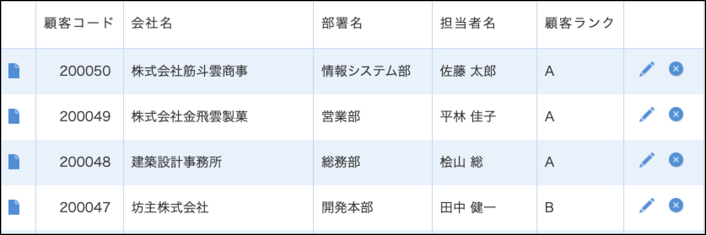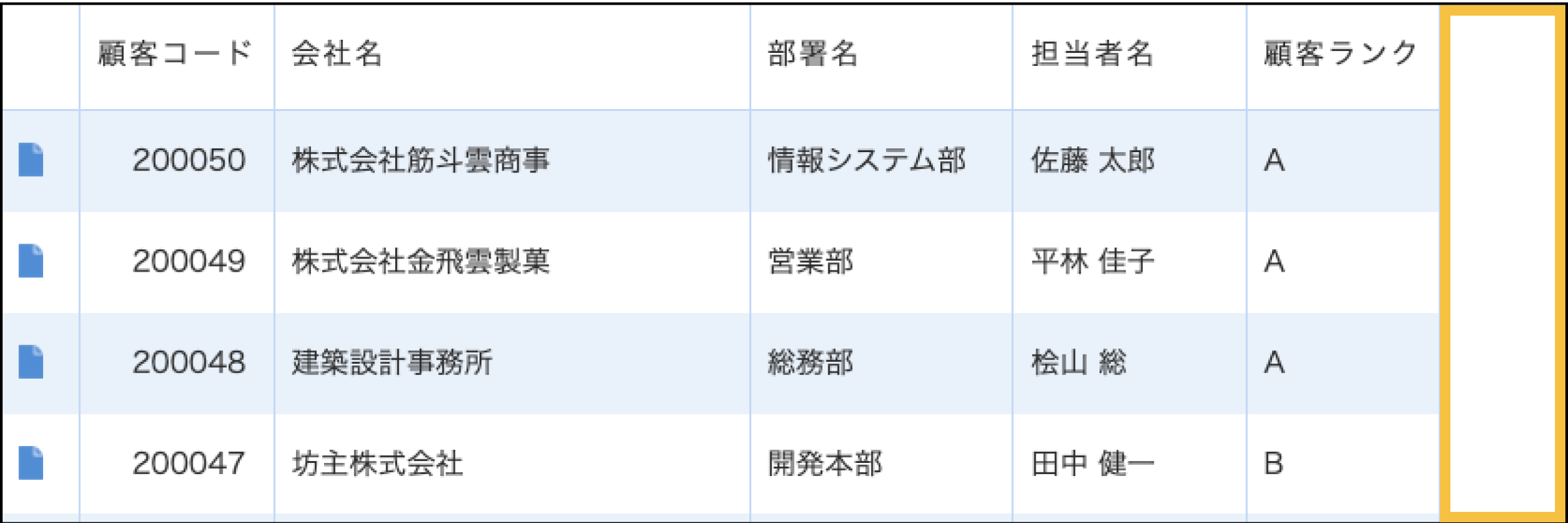 「レコード一覧での編集と削除を有効にする」設定を「オフ」にすると、レコード一覧に、編集・削除ボタン列が表示されなくなります。