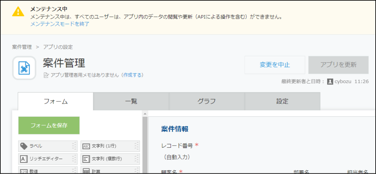 アプリを一時的に非公開にする設定(メンテナンスモード)を追加しました。メンテナンスモード中のアプリを開こうとすると、アプリがメンテナンス中であることを示す画面のみが表示され、レコードの閲覧などの、アプリの利用ができなくなります。なお、アプリ管理者による、アプリ設定の閲覧や更新は引き続き可能です。