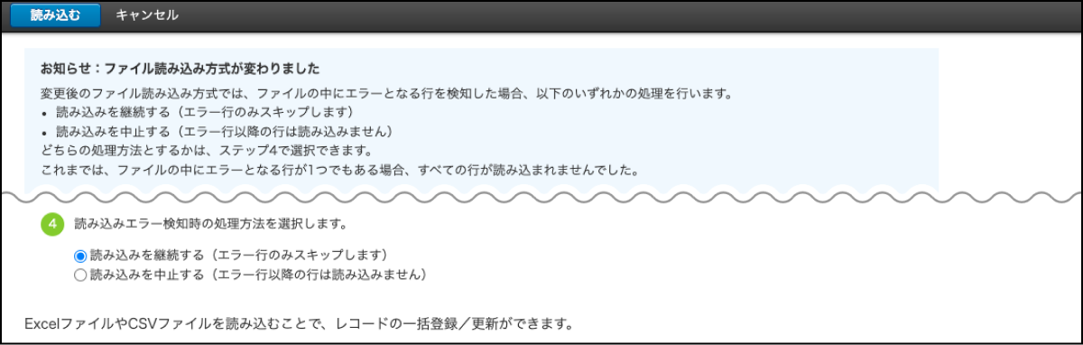 ファイル読み込み中にエラーを検知した場合の処理は、読み込み手順のステップ4にて引き続き選択することができます。デフォルトでは「読み込みを継続する」処理が選択されています。