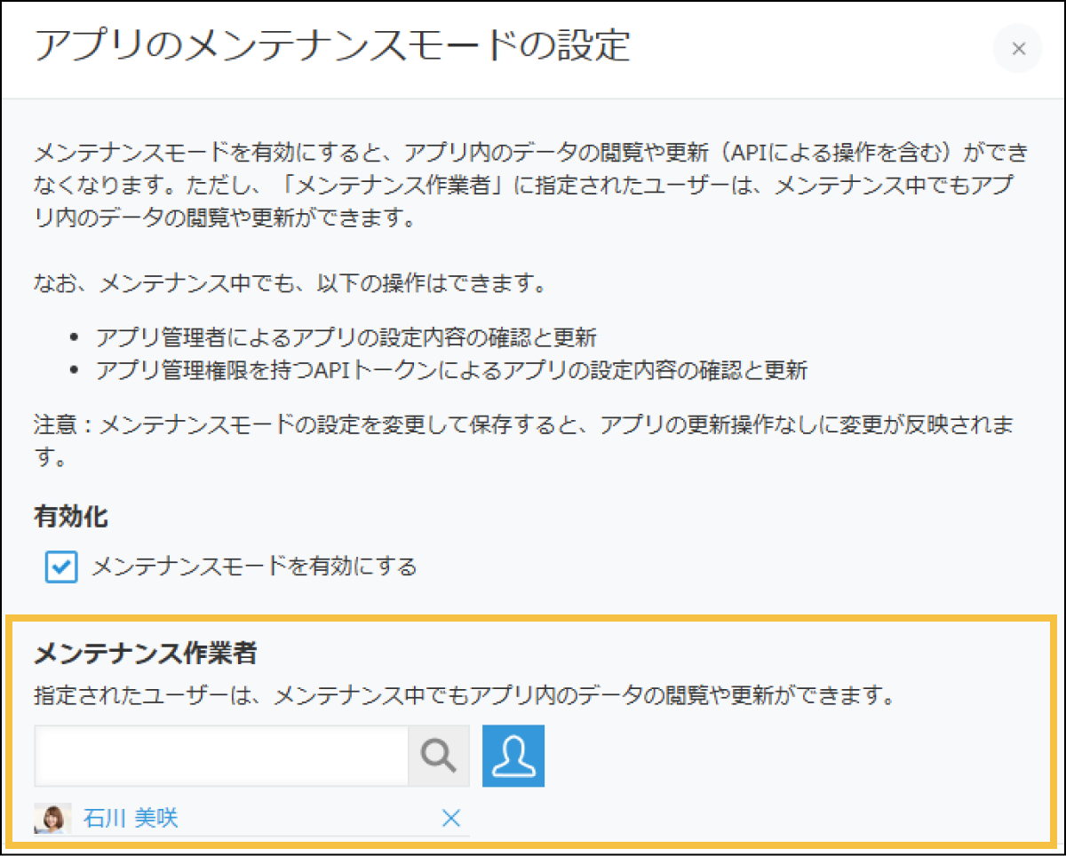 アプリのメンテナンスモードの設定で、メンテナンスモード中、特定のユーザーにはレコードの閲覧や更新などの操作を許可できるようになりました。