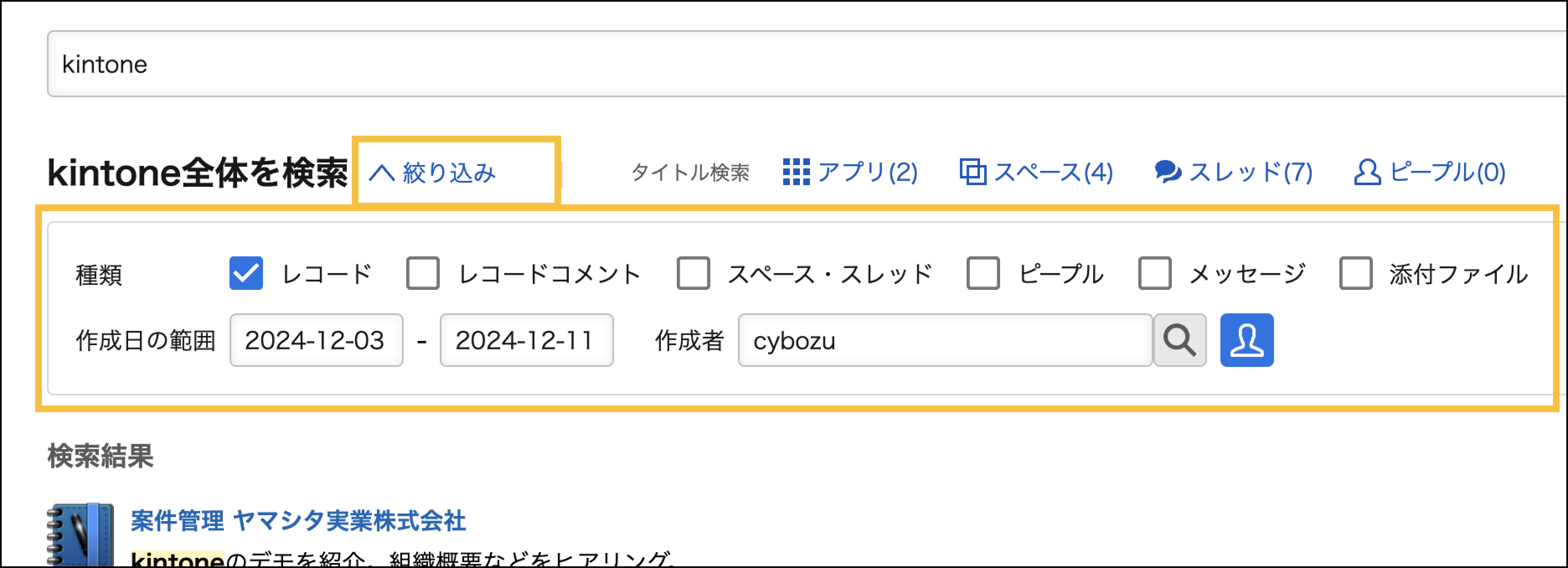 たとえば、過去のやり取りを探す際には「レコードコメント」や「スペース・スレッド」のみを指定したり、書類を探すときには「添付ファイル」のみを指定して検索することができます。これにより、目的に合わせた検索がより簡単に行えるようになります。