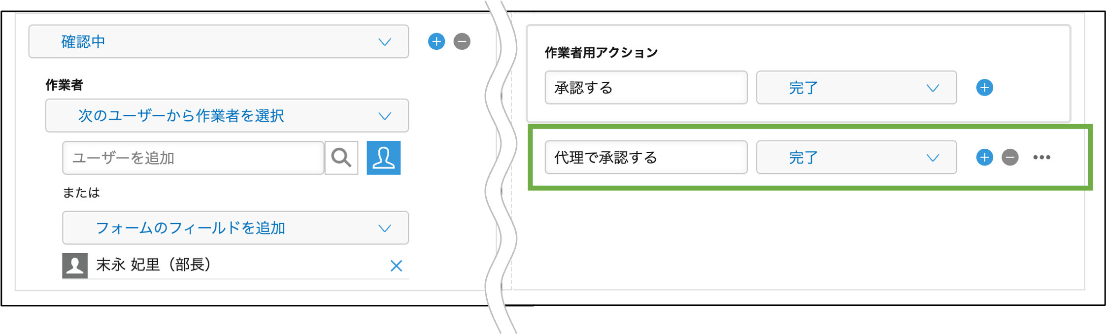 作業者の代わりにステータスを進めてほしいユーザーが決まっている場合、そのユーザーをアクション実行可能なユーザーとして直接指定することで、例えば部長のユーザーの代わりに副部長のユーザーがレコードの内容を確認し、ステータスを進めるようなプロセスを設定することができます。