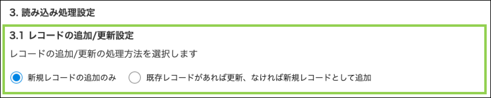 ファイル読み込みの設定で、新規レコードの追加のみを行うか、既存のレコードの更新または新規レコードの追加を行うかの選択項目が設けられた、新しいファイル読み込み画面の提供を開始しました。これにより、レコードの更新を伴う読み込みの設定を行いやすくなります。これまでのファイル読み込み画面では、ファイルをどのように読み込むかは「一括更新のキー」の有無でしか設定できませんでした。
