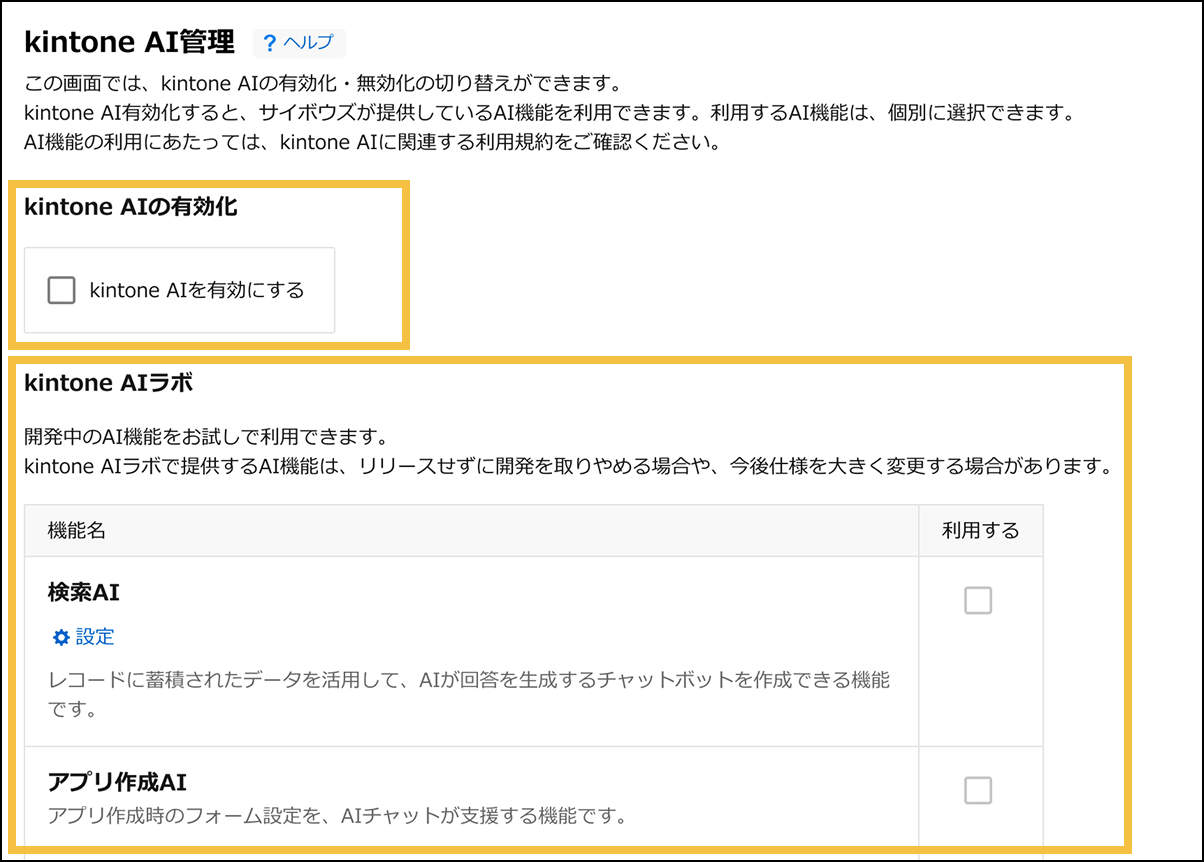 AI機能を管理する「kintone AI管理」ページが新設され、同ページ内で「kintone AIラボ」として提供する機能が追加されていきます。