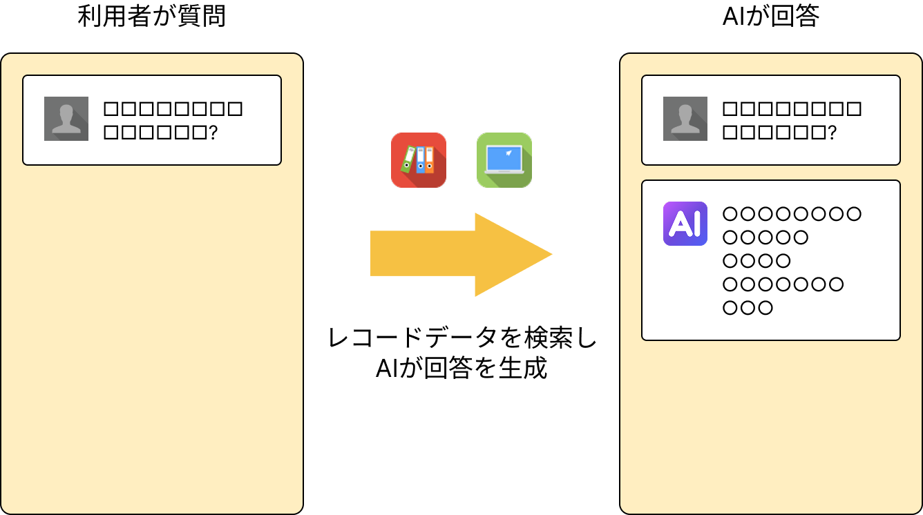 これにより、たとえば社内システムの利用手順や社内規定などをアプリに蓄積しておくだけで、AIが利用者にシステムの使い方や申請方法を自動で案内するシステムなどを構築できます。利用者は、担当部署やレコード登録者に問い合わせることなく、疑問や質問を解決できるようになります。