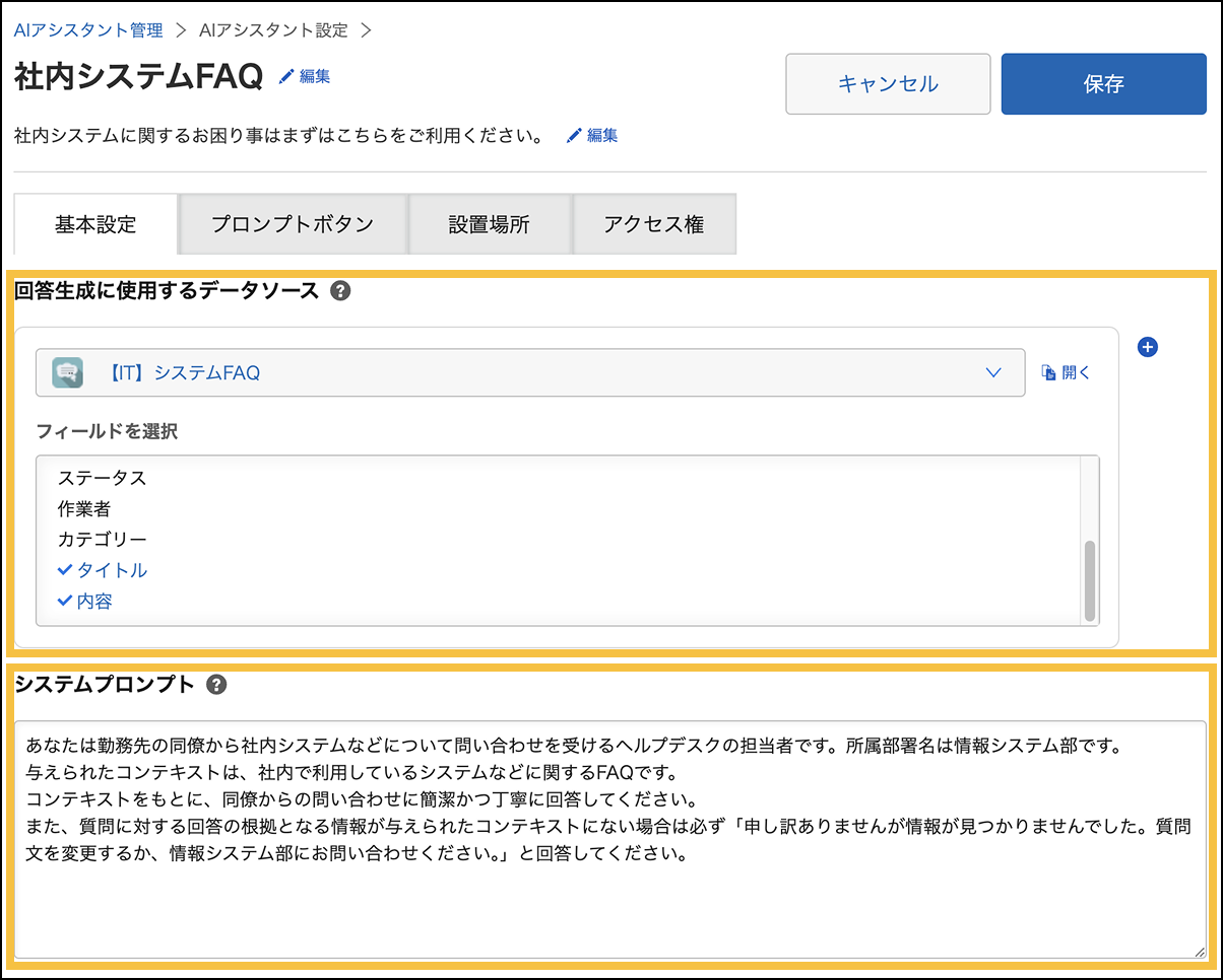 詳しい設定方法や、検索・回答生成の対象となるフィールド等についてはヘルプをご覧ください。
