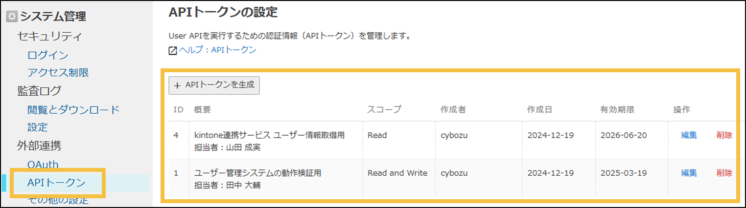 cybozu.com共通管理画面にAPIトークンの設定画面が追加されました。この画面でトークンの生成や管理を行うことができます。各トークンには概要、スコープ、有効期限を設定できます。