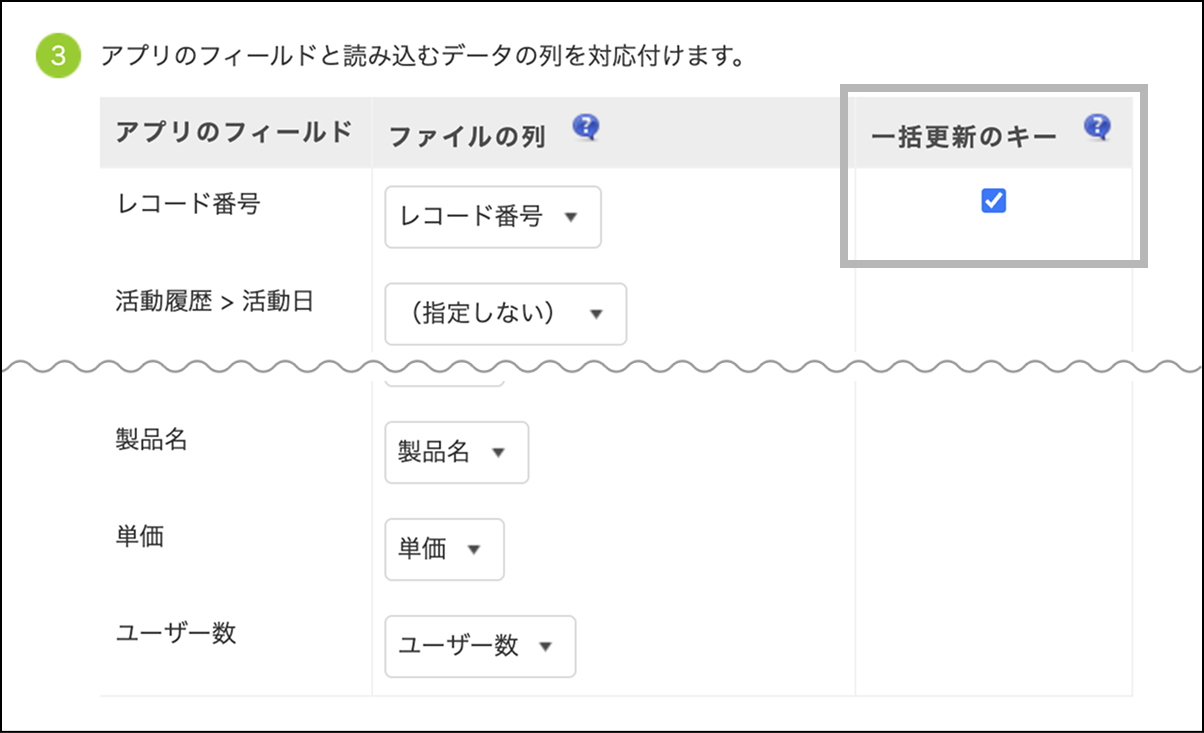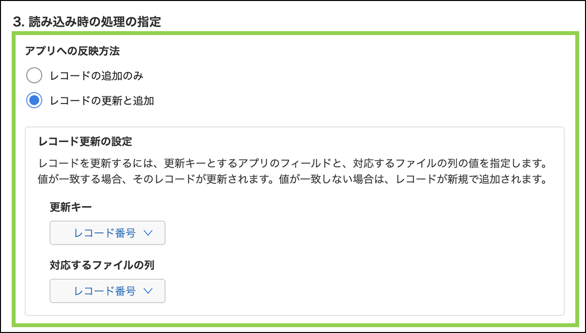 「レコードの更新と追加」を選択した場合にのみ、更新キーとするアプリのフィールドと、対応するファイル内の列を指定する設定項目が追加で表示されます。