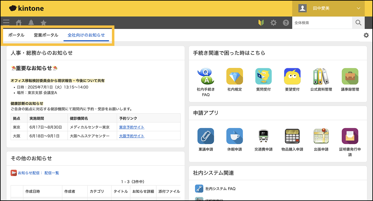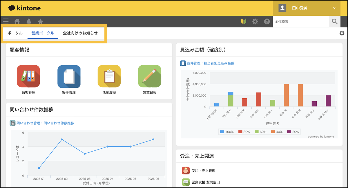 例えば、営業部のメンバーがログイン直後にkintoneを開いた際に、「営業ポータル」が最初に表示されるように設定できます。