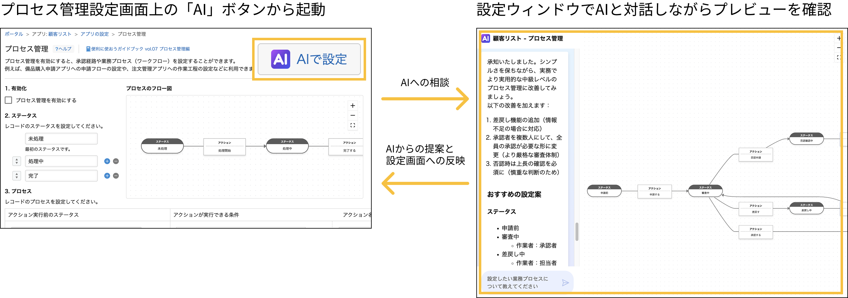 | AI機能 | プロセス管理設定AI:AIと対話しながらプロセス管理の設定を進められる機能 |