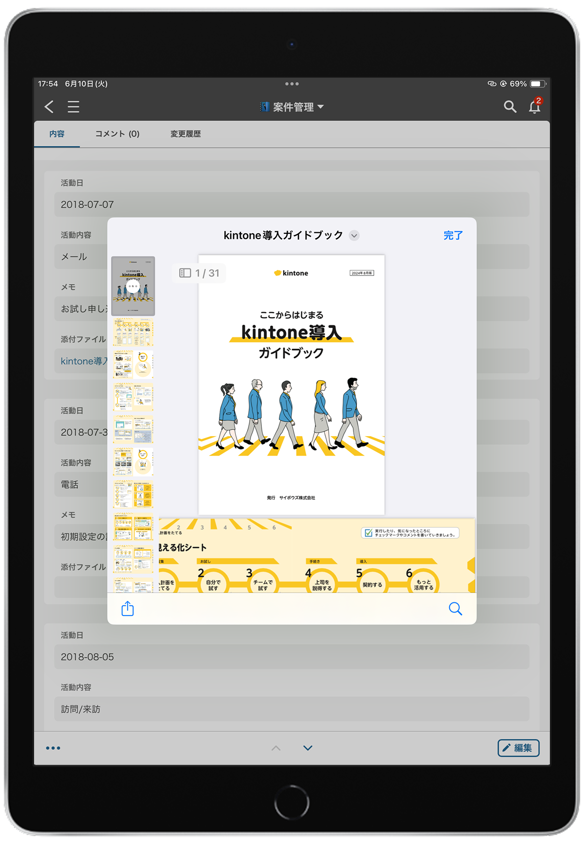 kintoneモバイルアプリをiPadで利用した際、レコード等に添付されたファイルが、全画面でプレビュー表示されるよう修正しました。修正を含むバージョン(v3.0.6)は、2025年6月13日に公開済みです。