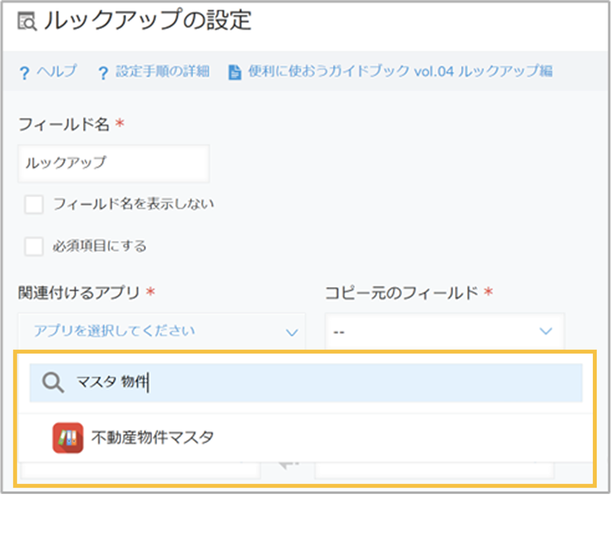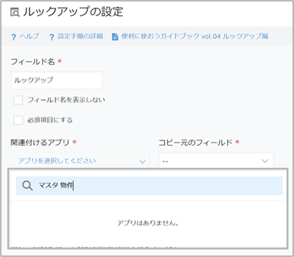 例:ルックアップの設定で「不動産物件マスタ」アプリを探している場合