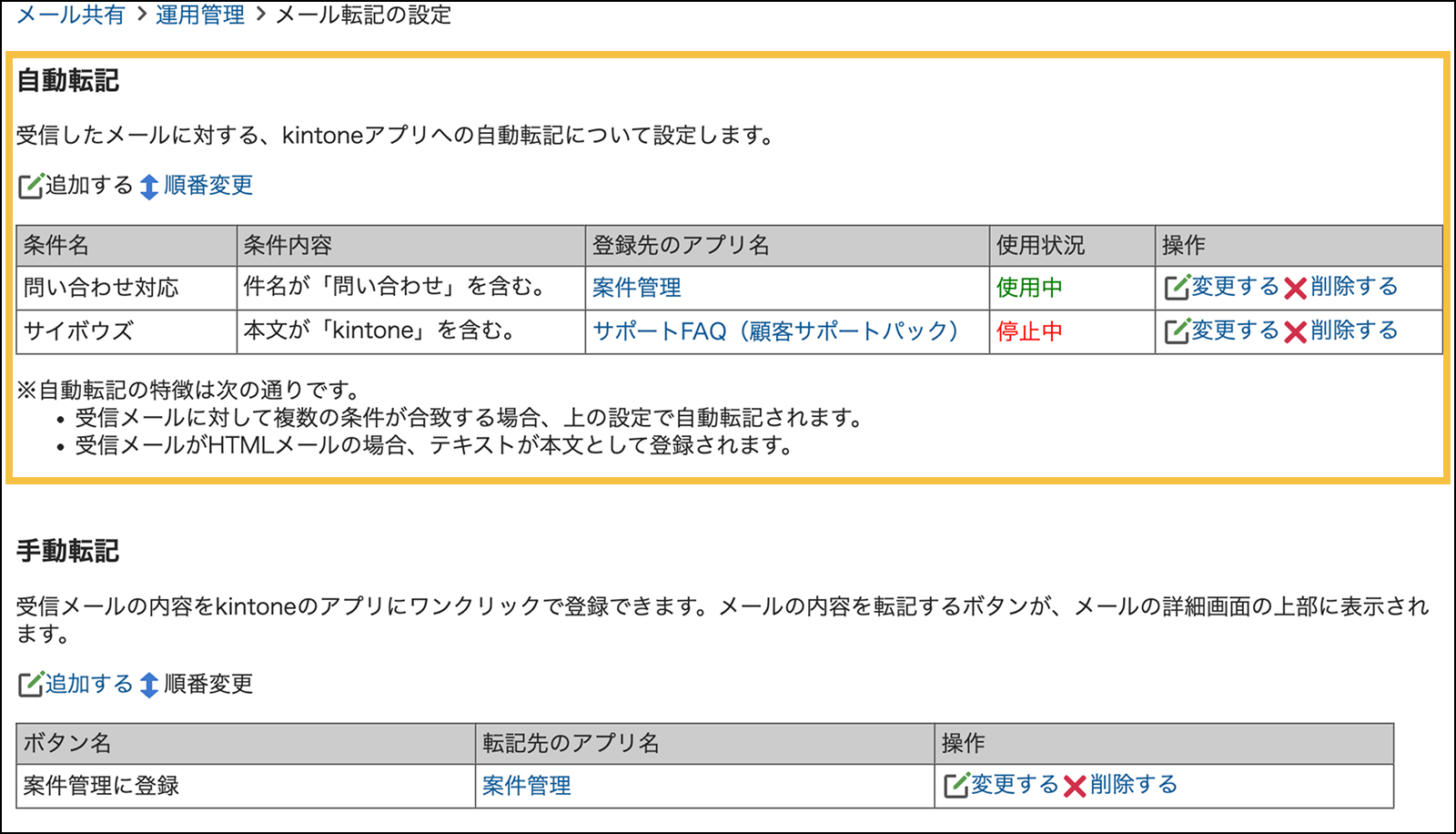 受信したメールのうち、条件を満たしたメールを自動転記される設定を行えるようになりました。