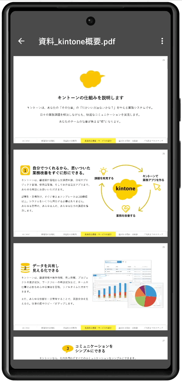 Android版 kintoneモバイルアプリにおいて、レコードに添付されたPDFファイルをプレビュー表示する際、ピンチイン/ピンチアウトで拡大・縮小できるようになりました。従来は、PDFファイル内の小さい文字などの詳細を確認したい場合、拡大・縮小に対応した他のPDFビューワーアプリで開き直す必要がありました。