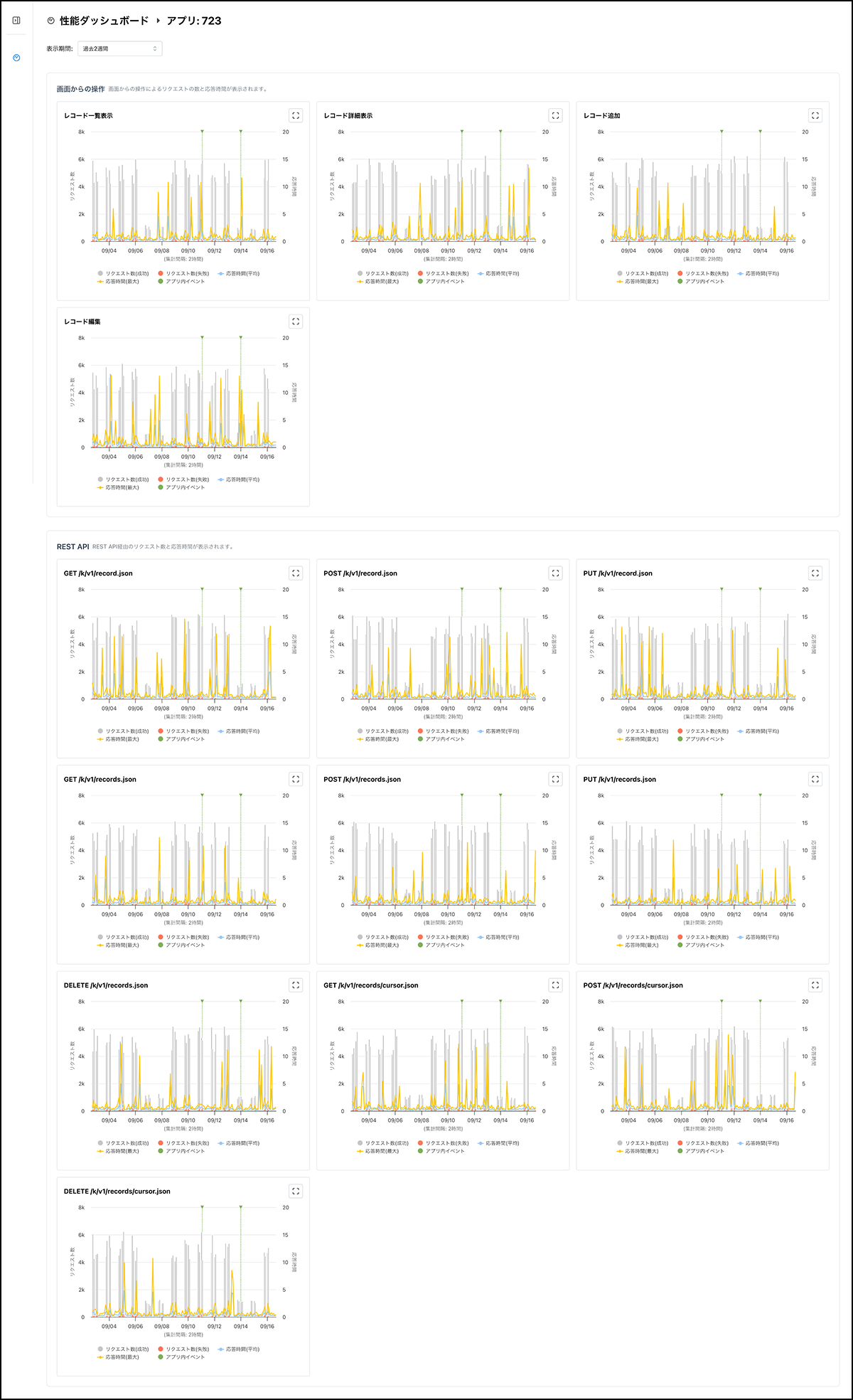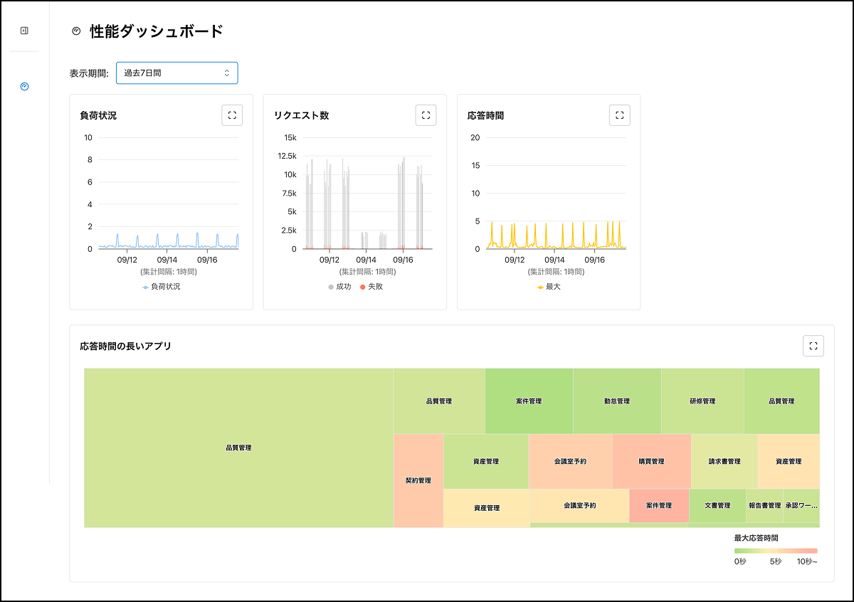 各アプリや環境全体のパフォーマンスをモニタリングするダッシュボードを提供開始します。本機能は、ワイドコースをご利用のお客様にお使いいただけます。多数のユーザーが利用する大規模な環境では、アクセスが集中したり大量のレコードが登録されている場合などに、アプリの設定やカスタマイズの内容によって性能が大きく左右されます。そこで本機能では、リクエスト数や応答時間などのメトリクスを可視化し、システムの状況を把握できるようにすることで、より性能を引き出せるように、改善が見込まれるポイントの特定や対策の実施を支援します。さらに、パフォーマンス低下の兆候を早期に発見し、各種メトリクスに基づいた改善の効果を検証することも可能となるため、監視・予測・改善のサイクルを継続的に回すことができます。